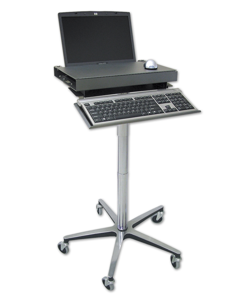 Features: Security Laptop Stand. Dual locking work surface keeps laptop and data secure and provides a large work area. Work surface adjusts from 35" to 45". Hand levers operate a gas spring lift to adjust height for sitting or standing use. Heavy 5-leg base for safety and stability. 3" rubber wheel casters for quiet use