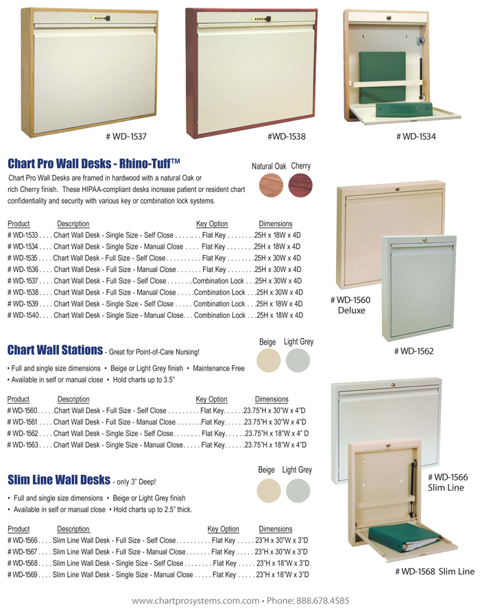 Chart Pro's Rhino-Tuff deluxe self-closing wall desks are essential for manual patient charting. Our 100% HIPAA compliant wall desks improve patient privacy and are great for point-of-care nursing.